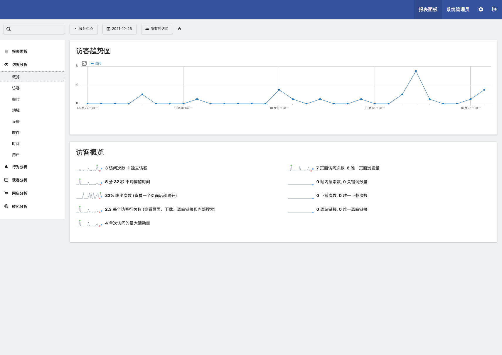 用户可以导航到:管理后台 > 统计分析 > 报表面板,查看网站统计分析报表。