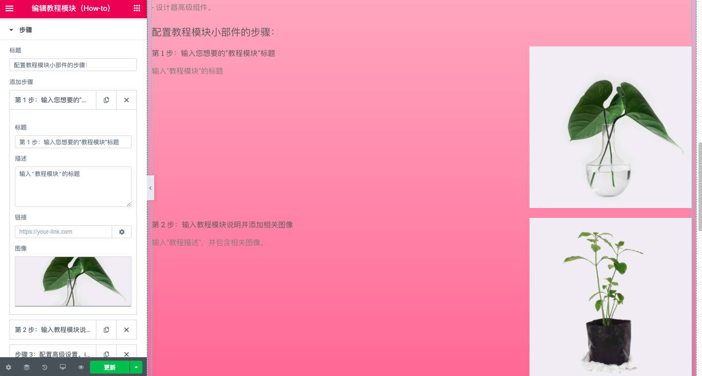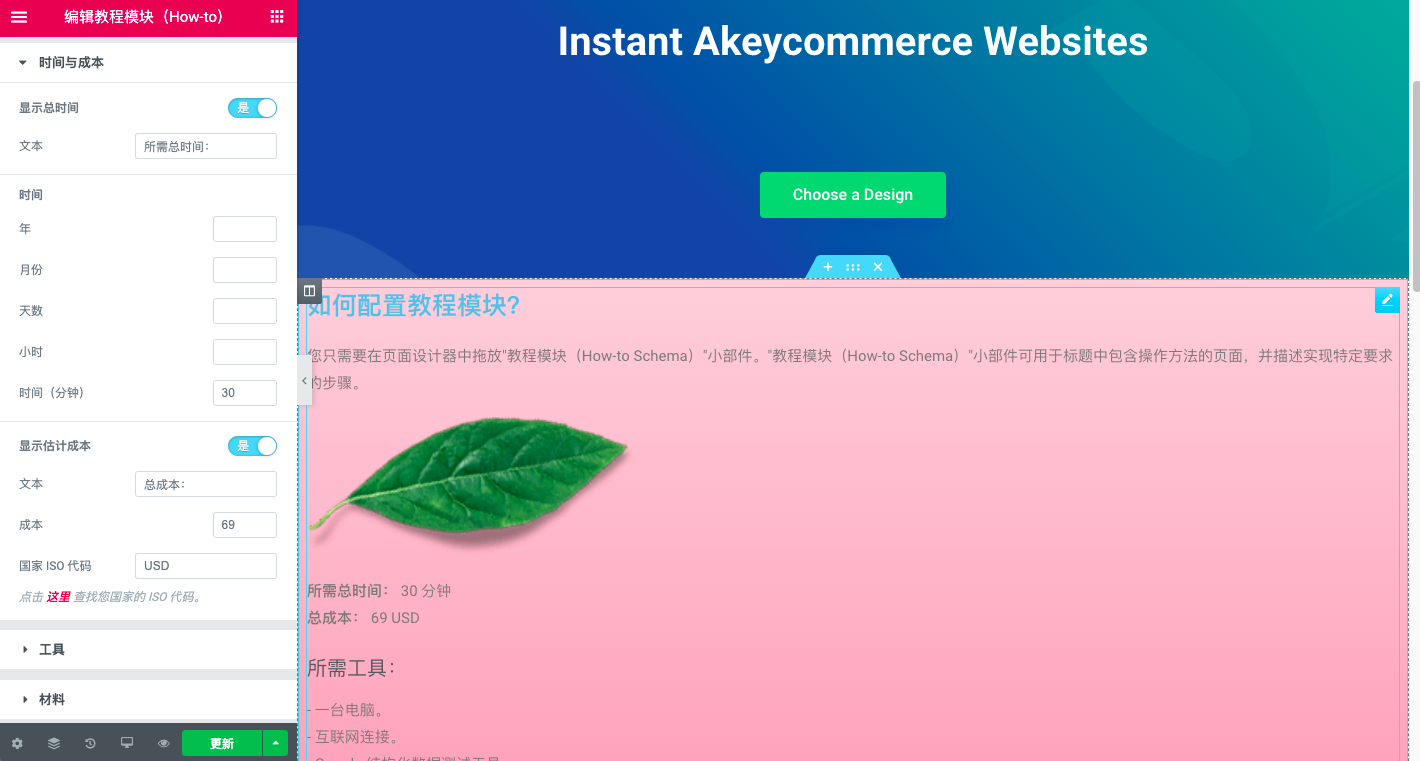 教程模块提供:教程标题、HTML 描述、图像、时间与成本、工具、材料、步骤等预制功能和样式效果。