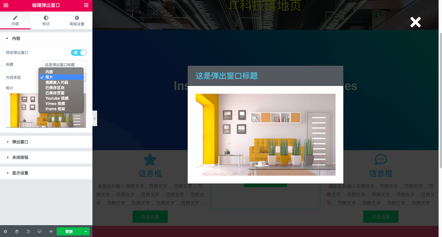 弹出窗口提供:弹出HTML内容、照片、视频、已保存区块、已保存页面、iframe框架等预制功能和样式效果。