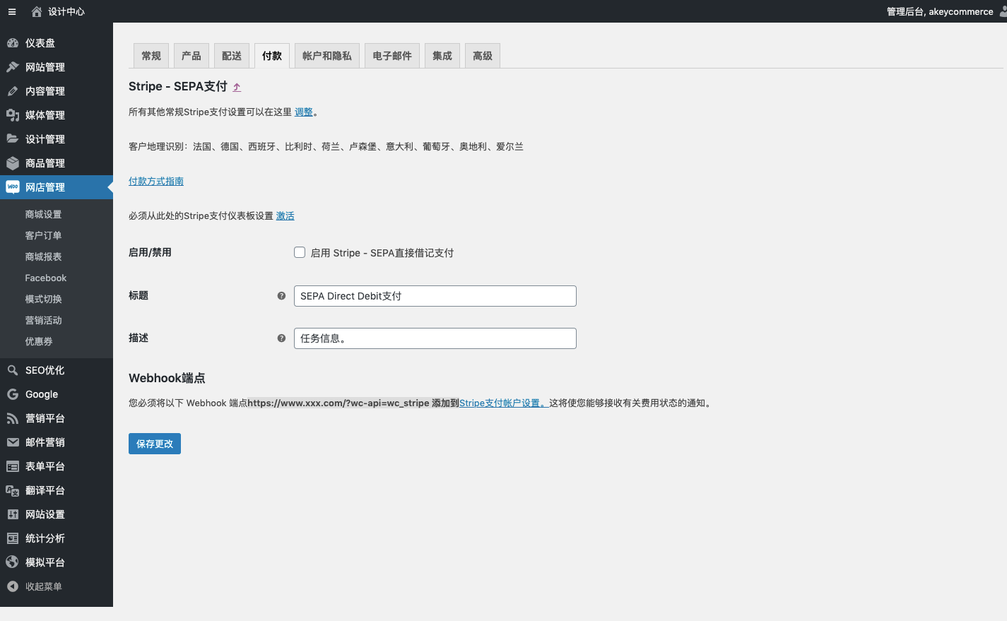 用户可以导航到:管理后台 > 网店管理 > 商城设置 > 付款(选项卡)> Stripe - SEPA支付(项目),进行商店的Stripe - SEPA支付设置管理。