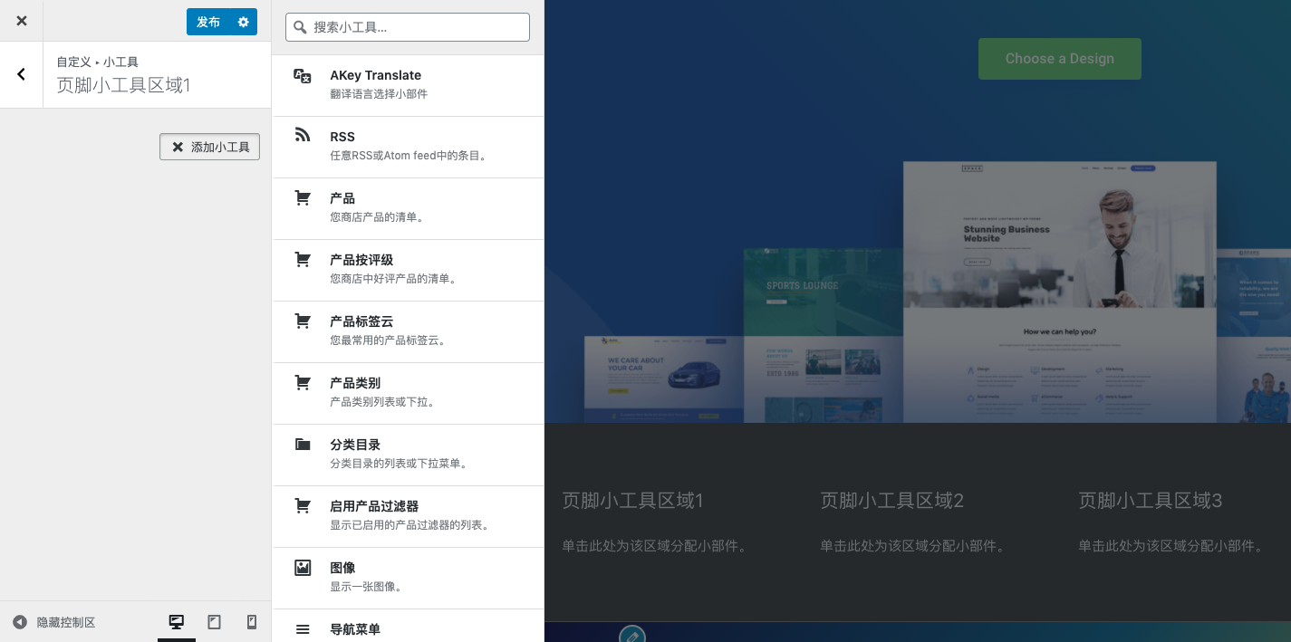 如果在“网站设计器 - 页脚 - 页脚小工具”中设置了显示小工具栏目的样式,就可以在此页面看到相应数量的小工具选项卡,点击页脚小工具选项卡,进行小工具的增加、修改、删除设置操作。