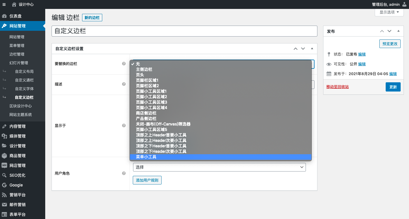通过设置:标题、要替换的边栏、描述、显示条件、用户角色,自定义边栏的内容将按指定显示条件显示于指定页面的已有边栏位置。