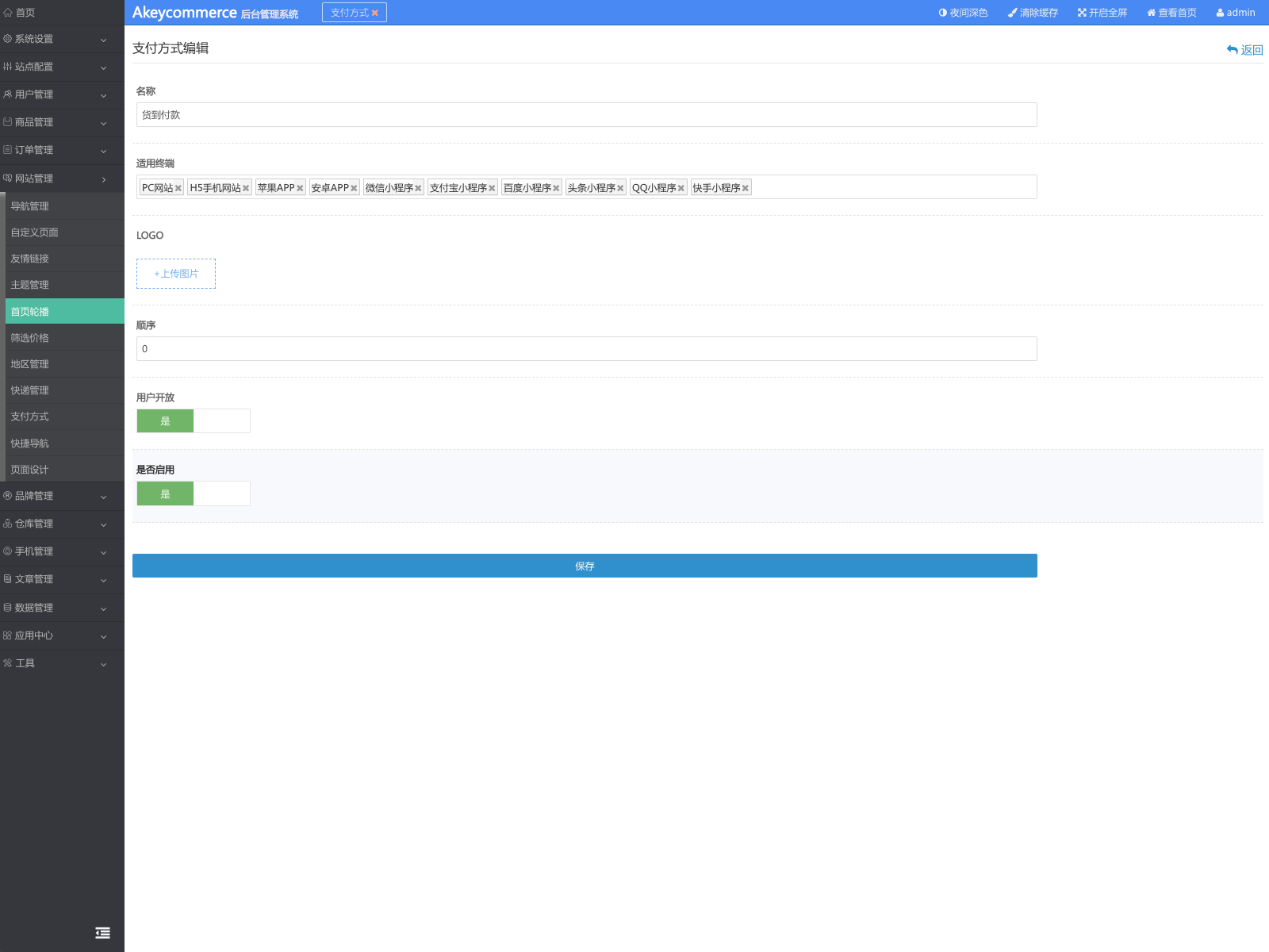 用户打开后台管理菜单,导航至:网站管理 -> 支付方式,可以进行支付管理操作,在支付管理列表中,用户可以选择安装和启用货到付款功能: