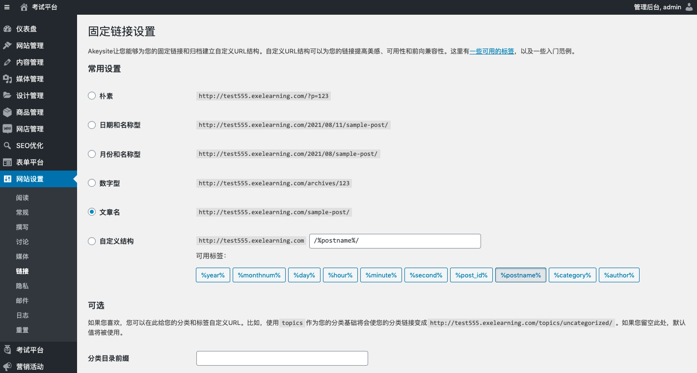 - 提示:如果考试内容在创建中出现 404 错误页面,可到此设置页面重新保存设置,以解决固定链接未刷新的情况。