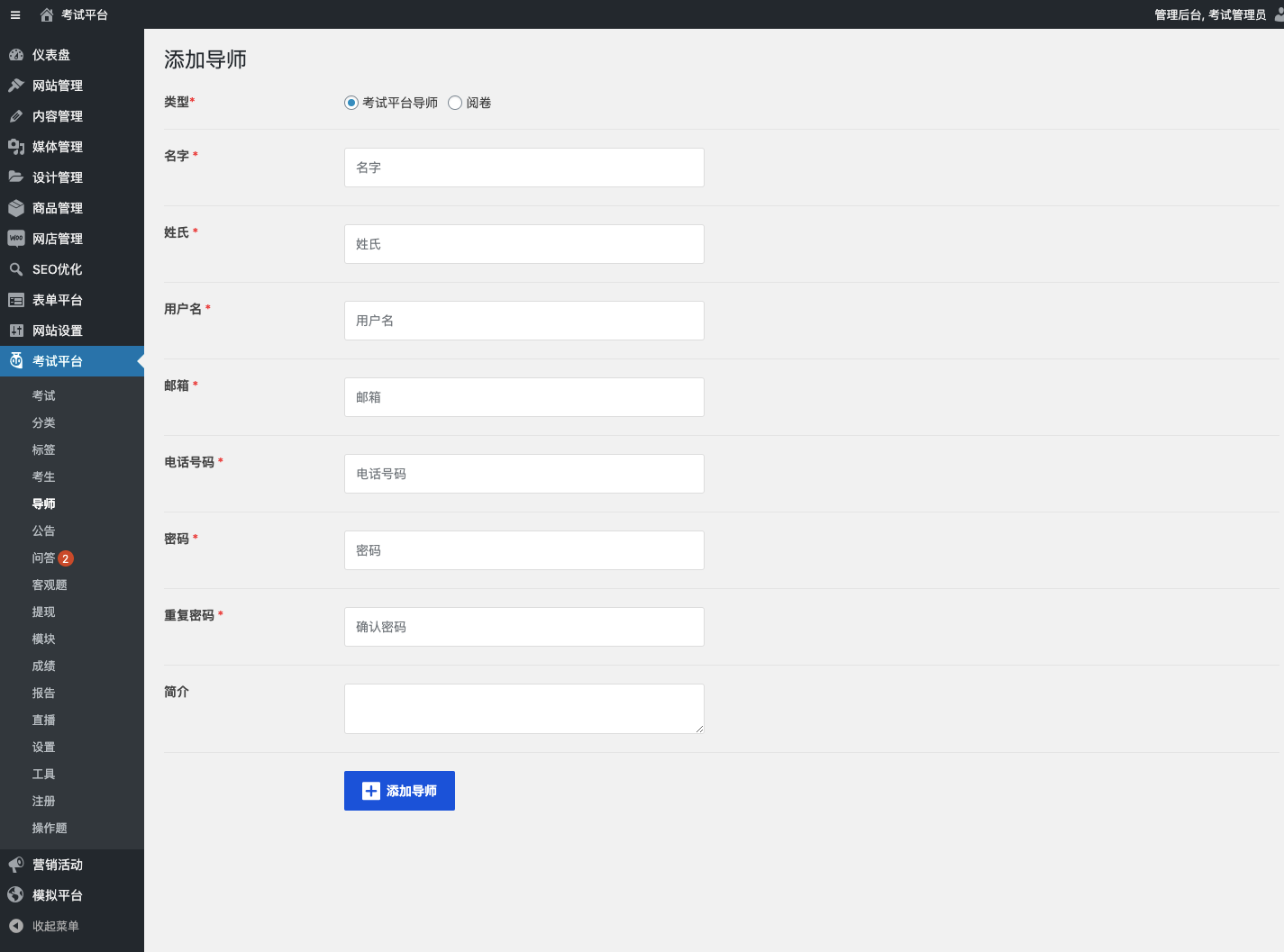 在另外,管理员可以通过导航到:管理后台 > 考试平台 > 导师 > 添加新导师,从后端手动创建导师。提供导师的信息后,在定义用户角色时,您需要选择“考试平台导师”。