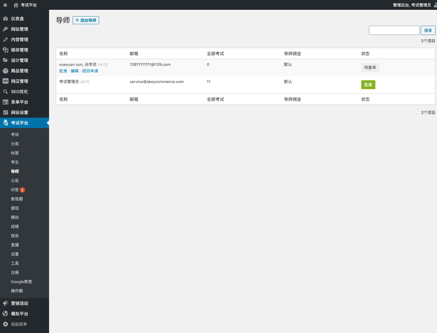 发送请求后,管理员将能够决定是批准还是阻止请求。该列表可以从:管理后台 > 考试平台 > 导师中找到。