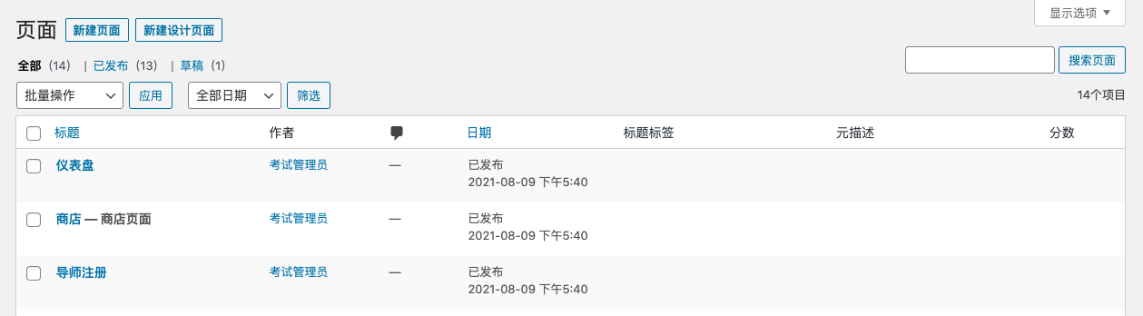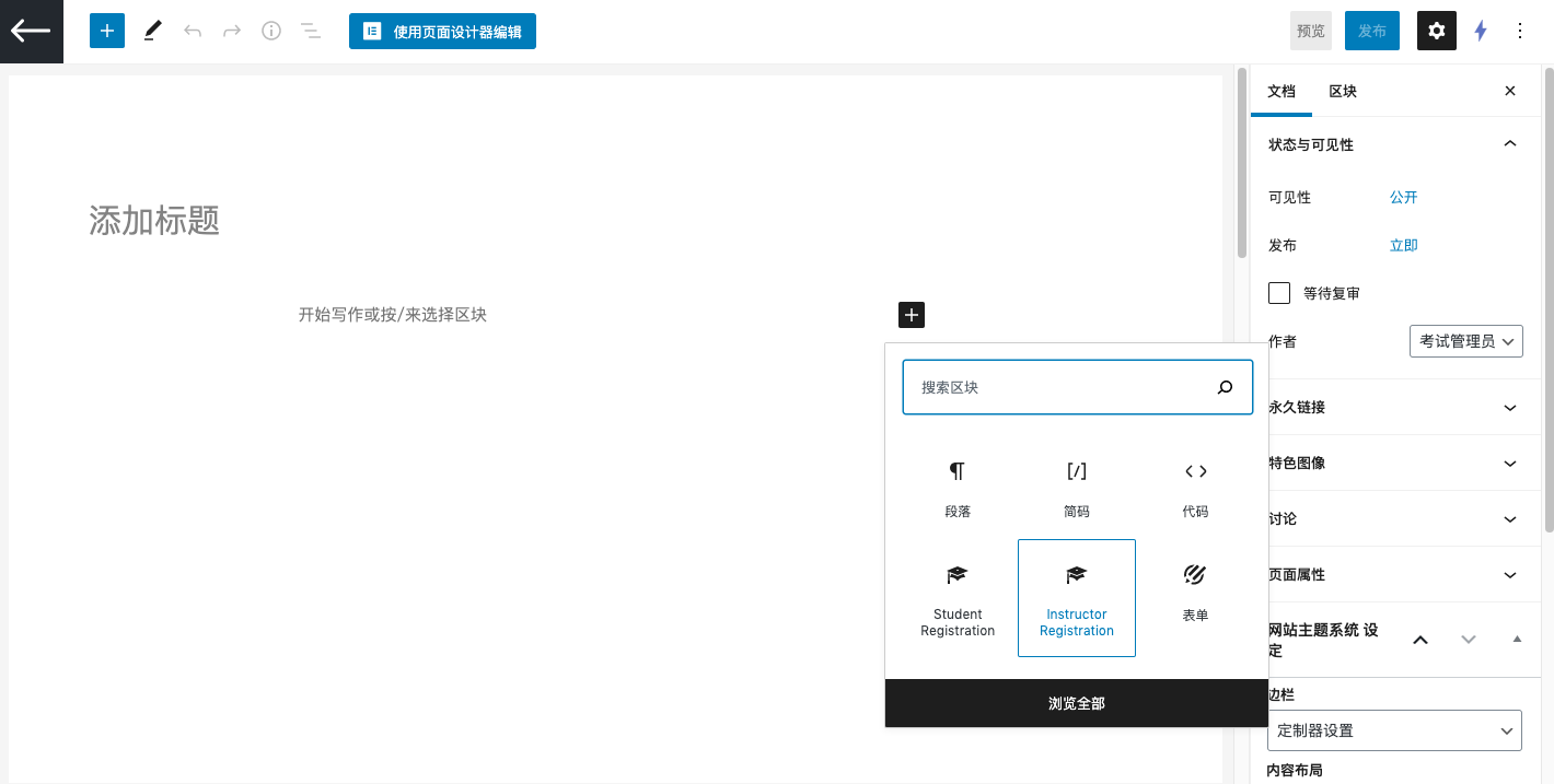 您需要导航到:管理后台 > 内容管理 > 新建页面。然后将导师注册短代码放在页面上;您也可以从设计块部分中找到“考试平台”块,然后从列表中选择“Instructor Registration”。如果您愿意,可以向页面添加更多内容。之后,您可以发布页面。