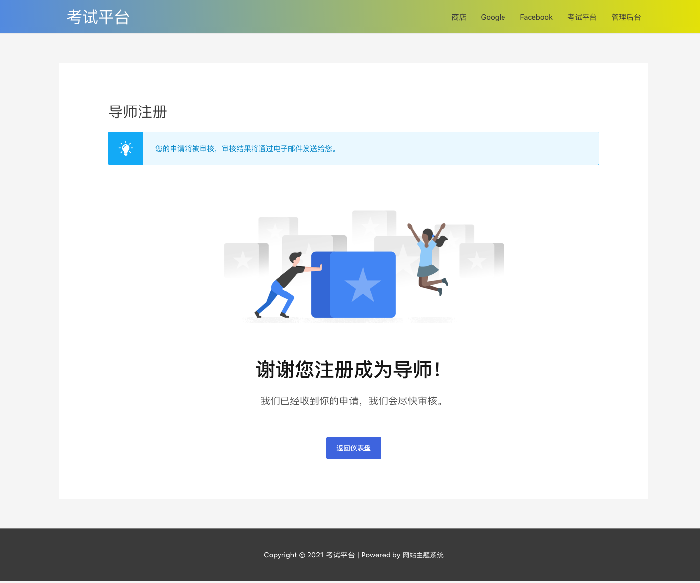 在管理后台中成为导师的过程与成为考生几乎相同。首先,您需要创建一个导师注册页面(或者不创建,因为在插件安装过程中为您提供了一个默认的导师注册页面)。
